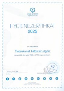 Unser Tattoo-Studio ist natürlich nach IfSG, MedHygVO, TRGS und TRBA hygienezertifiziert – durch unseren Hygienepartner clean protect. Alle Tätowierer besitzen einen entsprechenden Sachkundenachweis für Tätowierer im Bereich Hygiene. Die entsprechenden Hygienezertifikate und Sachkundenachweise kannst du hier nachfolgend einsehen.